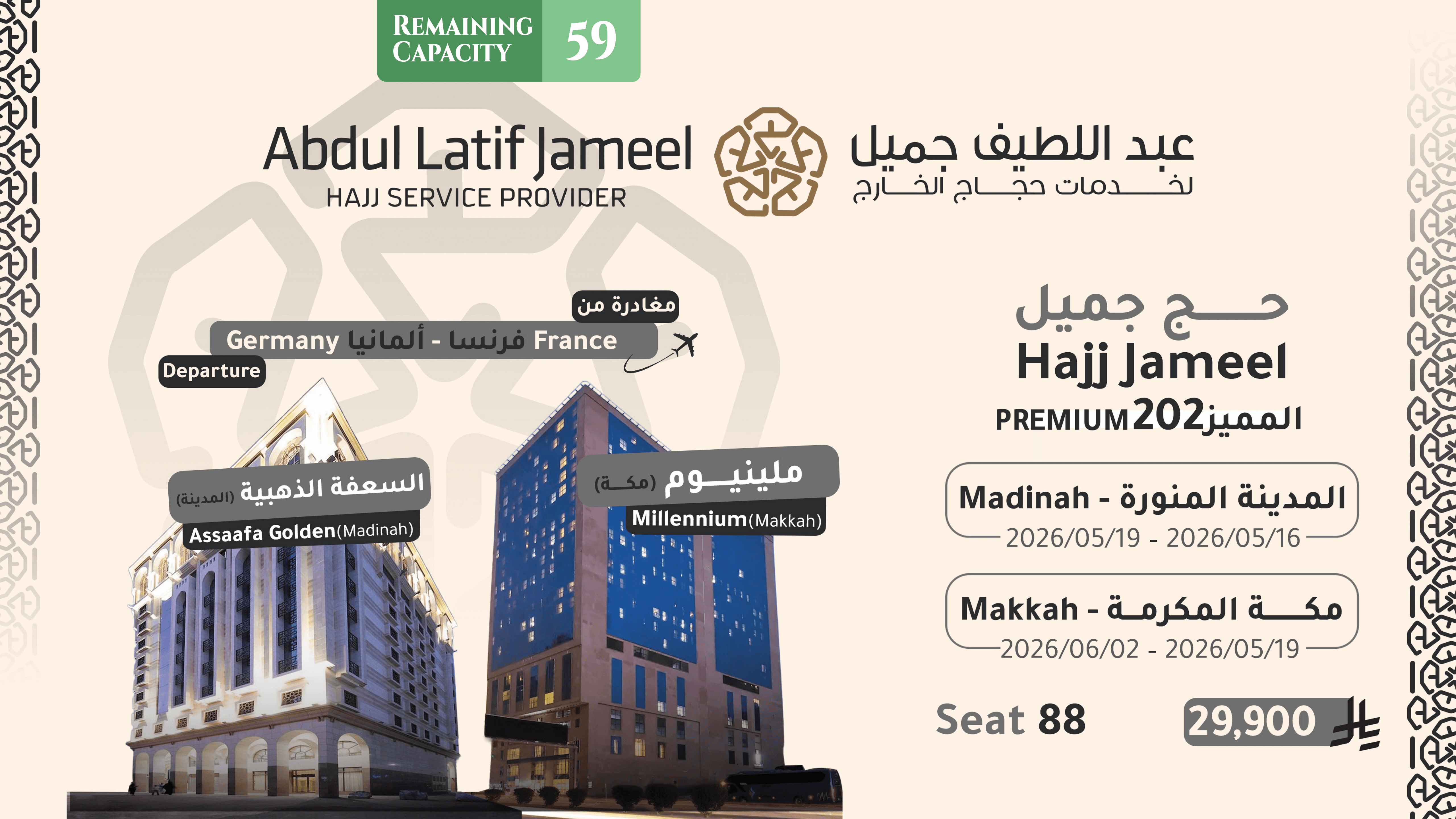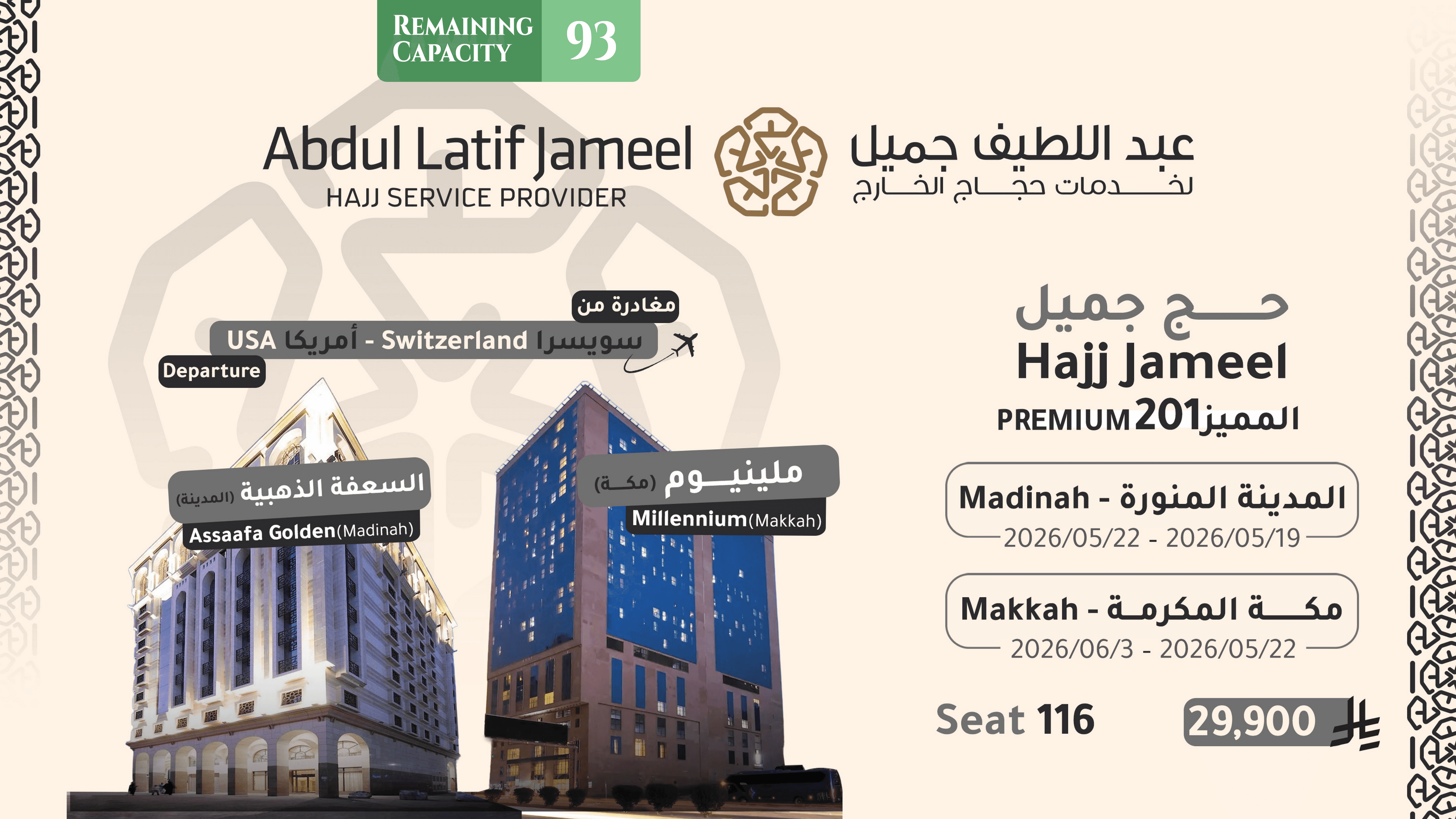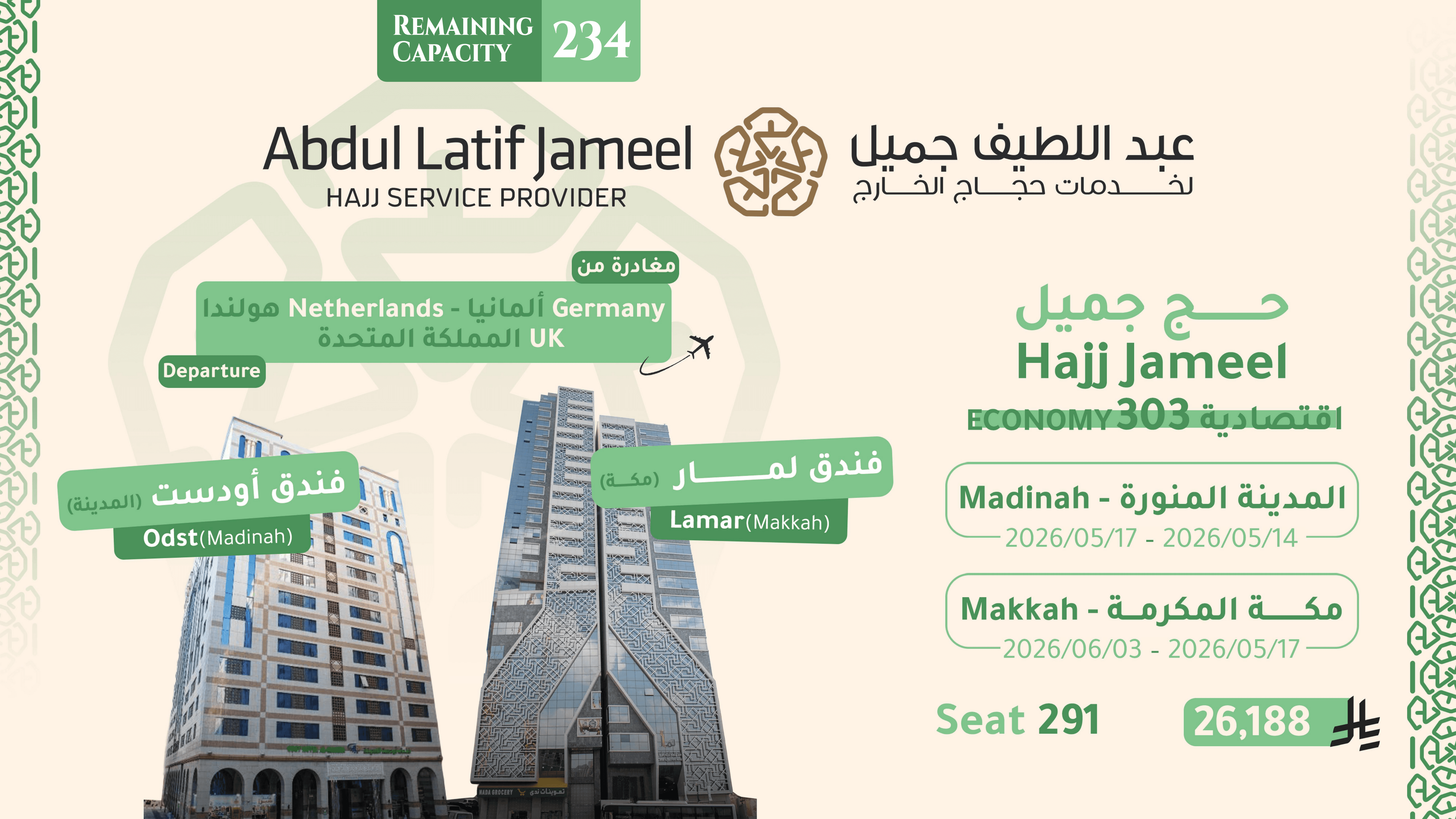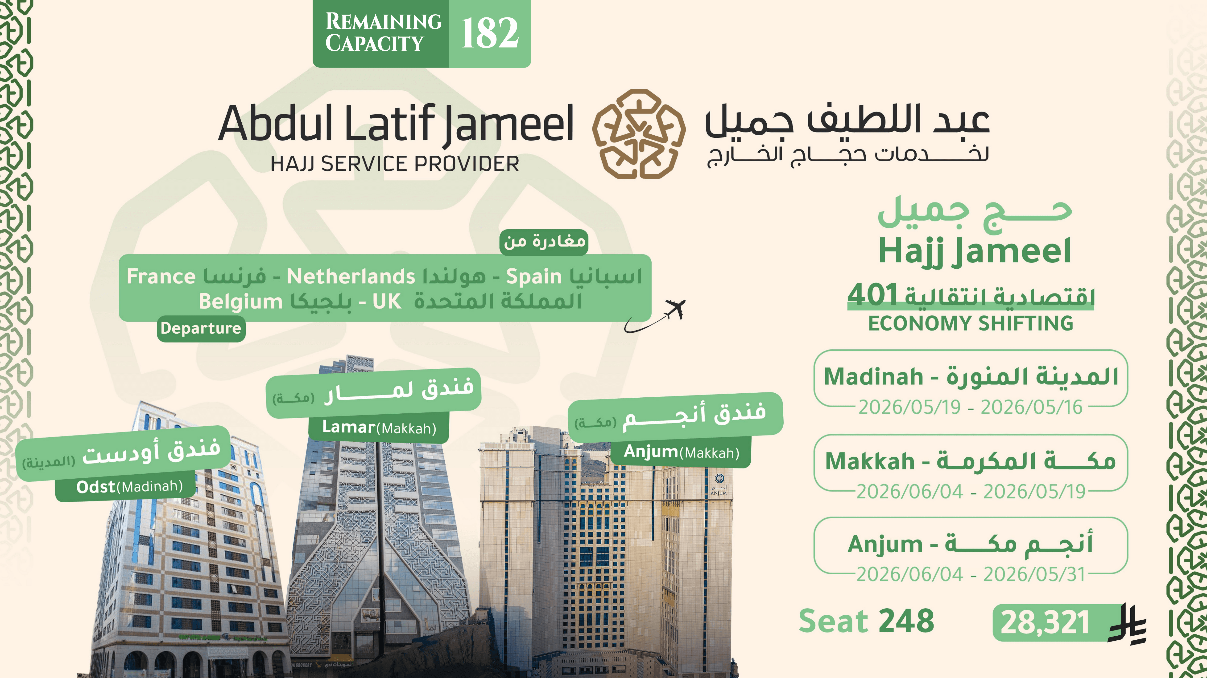 Tayseer begeleidt alle Hadj-pakketten van serviceprovider Abdul Latif Jameel, een erkende partner binnen het officiële Hadj-systeem van Saoedi-Arabië. De verkoop en registratie verlopen uitsluitend via het officiële Nusuk-platform, zoals voorgeschreven door het Ministerie van Hadj en Umrah. Wij ondersteunen hujjāj gedurende het volledige traject: van advies bij pakketkeuze en Nusuk-registratie tot begeleiding tijdens de reis en de uitvoering van de Hadj-rituelen. Door samen te werken met Abdul Latif Jameel en het officiële Nusuk-kanaal, garanderen wij een betrouwbaar, transparant en conform de regelgeving georganiseerd Hadj-traject. Met Tayseer kies je voor officiële Hadj-pakketten, deskundige begeleiding en een zorgeloze voorbereiding op een van de belangrijkste spirituele reizen in het leven.