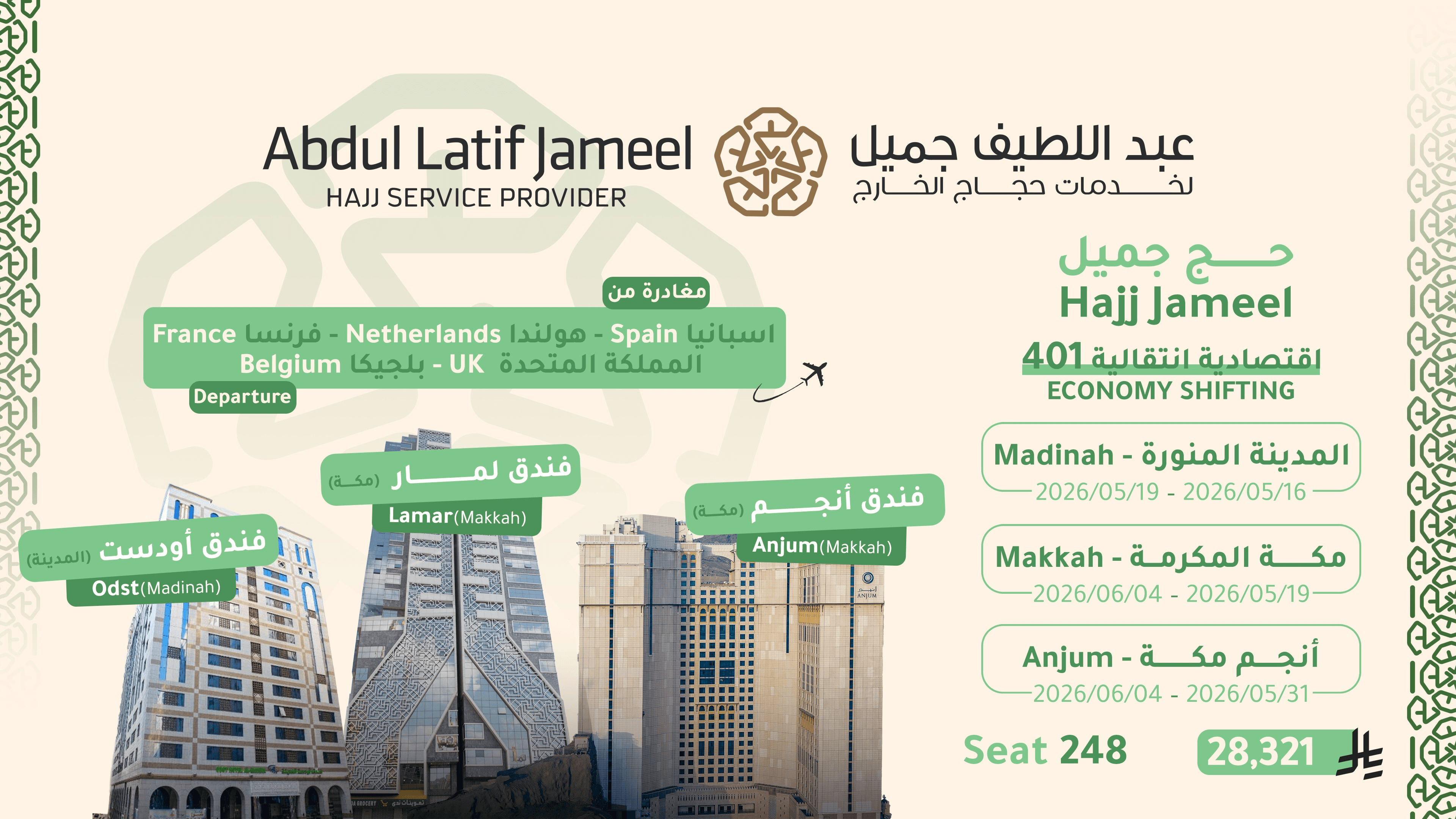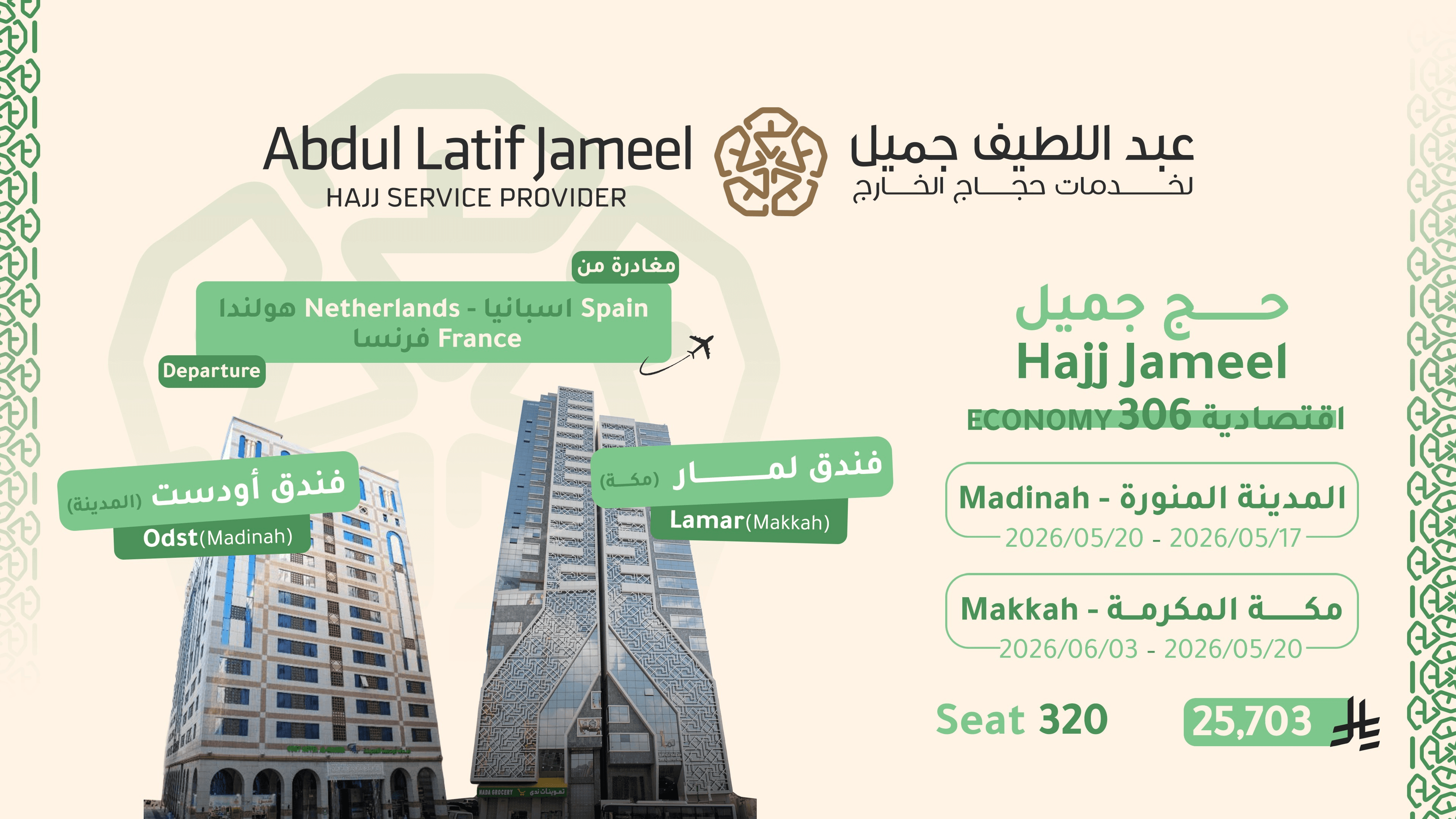 Bekijk een overzicht van de beschikbare hadj-pakketten voor 2026 (1447H), met inzicht in verblijfsduur, hotels, zones en prijsindicaties. Alle pakketten zijn beschikbaar via het officiële Nusuk-platform en worden persoonlijk door ons begeleid.